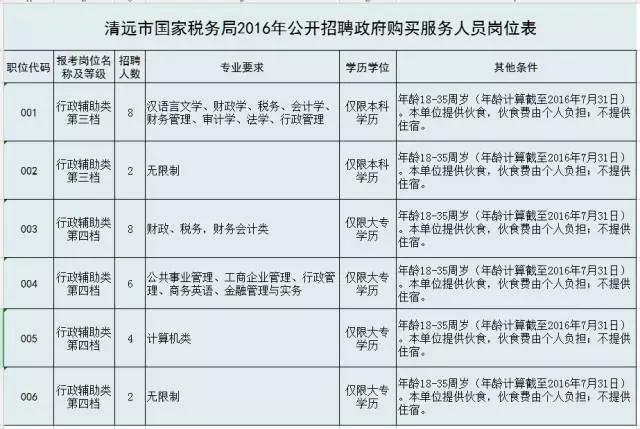 具體招聘職位和人數(shù)見《清遠(yuǎn)市國家稅務(wù)局2016年公開招聘政府購買服務(wù)人員崗位表》(附件1)。